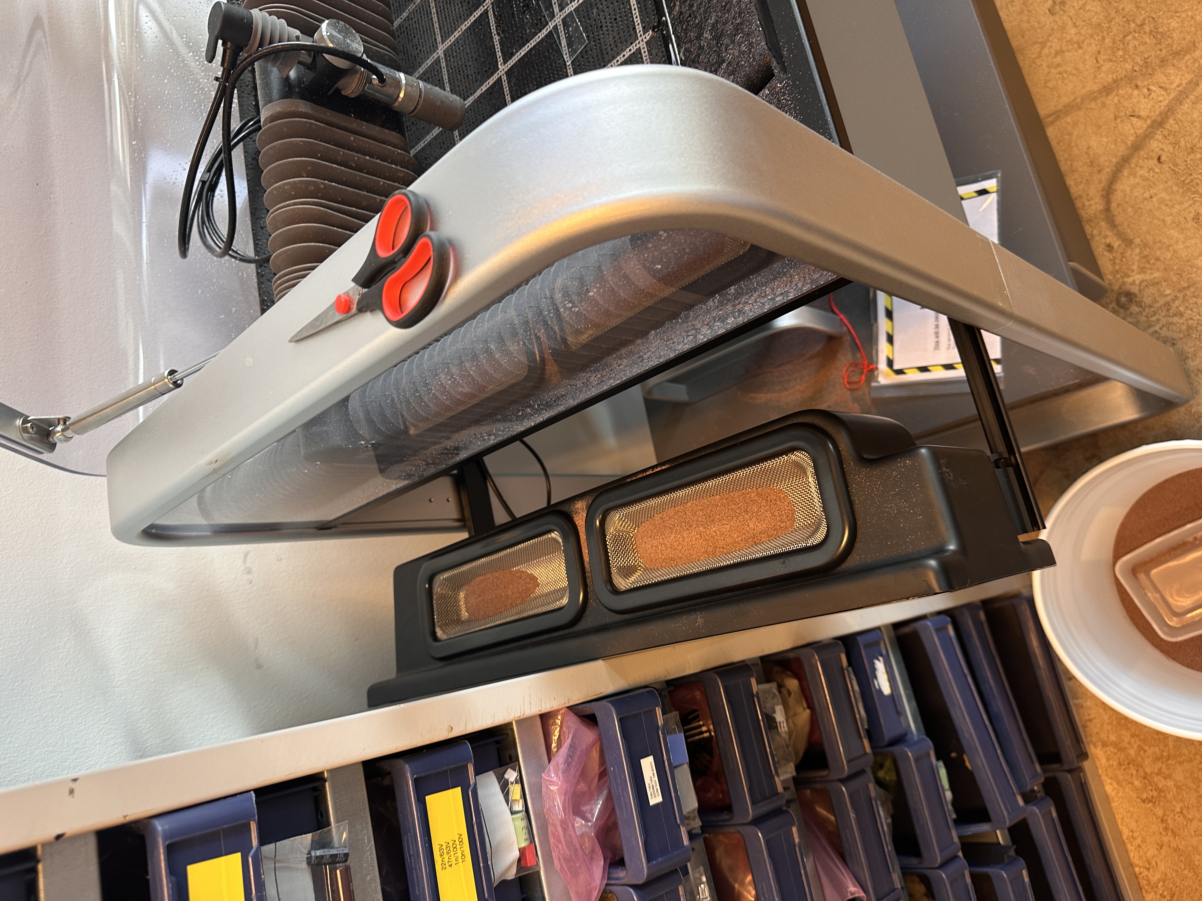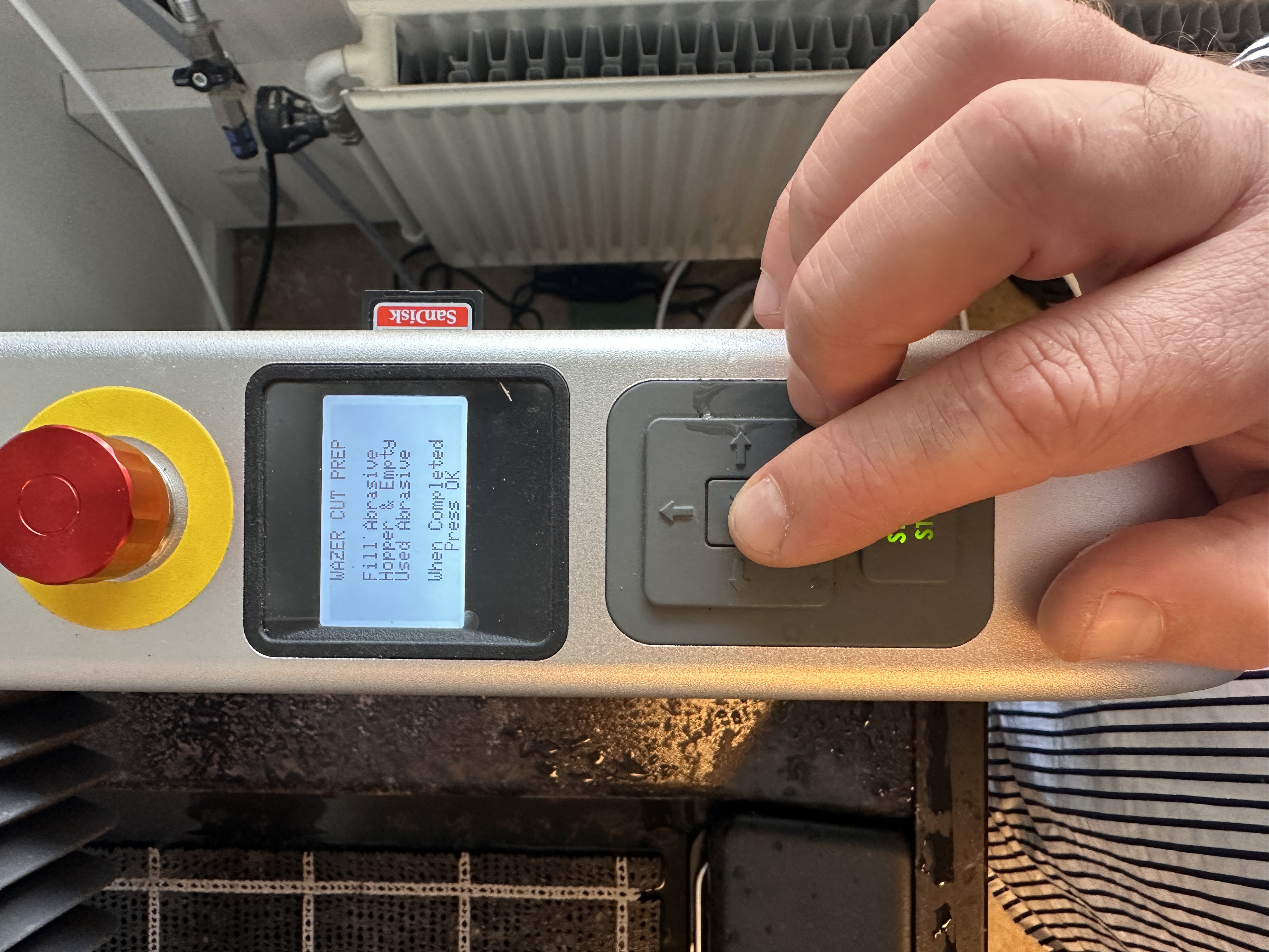 The machine will now ask you to empty the used abrasive baskets, and fill the hoppers with abrasive.